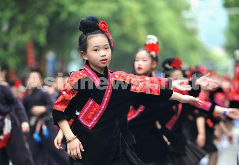图片说明:2023年5月2日,苗族女孩在参加“中国台江2023苗族姊妹节”盛装游演。