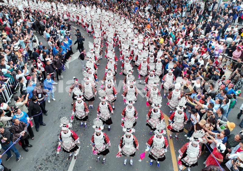 图片说明:2023年5月2日,苗族同胞在参加“中国台江2023苗族姊妹节”盛装游演。