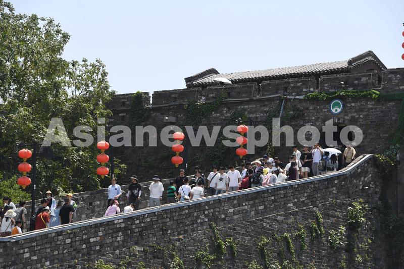 图片说明:2023年5月2日,游客在南京明城墙解放门段参观游览。