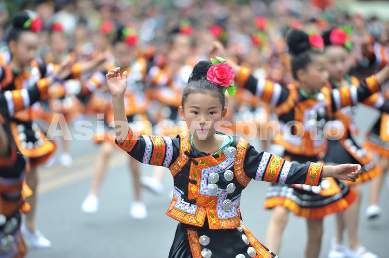 图片说明:2023年5月2日,苗族女孩在参加“中国台江2023苗族姊妹节”盛装游演。