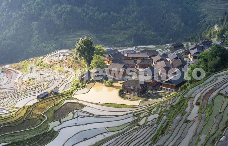 图片说明:2023年5月2日,在贵州省黔东南苗族侗族自治州从江县加榜乡境内拍摄的梯田风光。