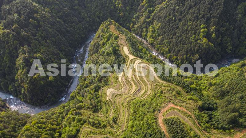 图片说明:2023年4月30日,在贵州省黔东南苗族侗族自治州从江县加榜乡境内拍摄的梯田风光。