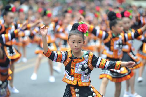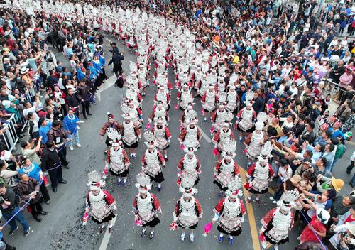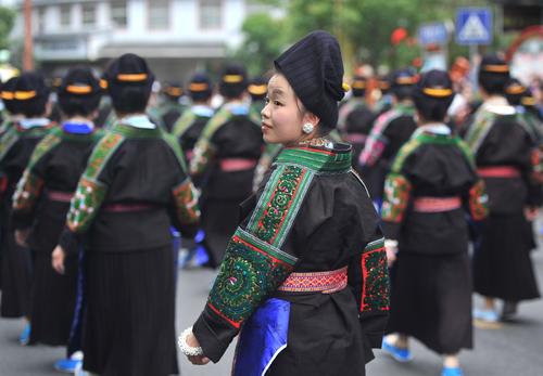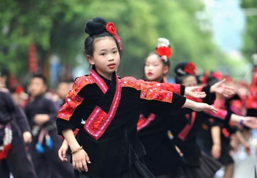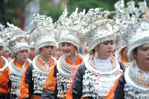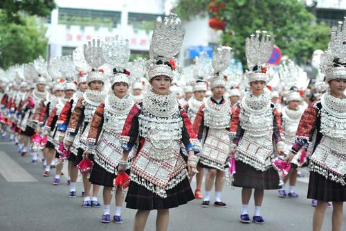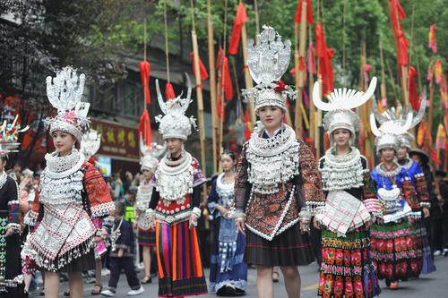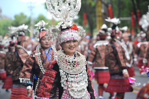 图片说明:2023年5月2日,苗族同胞在参加“中国台江2023苗族姊妹节”盛装游演。