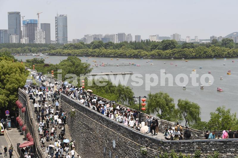 图片说明:2023年5月2日,游客在南京明城墙解放门段参观游览。
