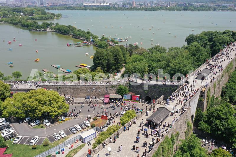 图片说明:2023年5月2日,游客在南京明城墙解放门段参观游览。