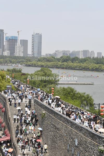 图片说明:2023年5月2日,游客在南京明城墙解放门段参观游览。