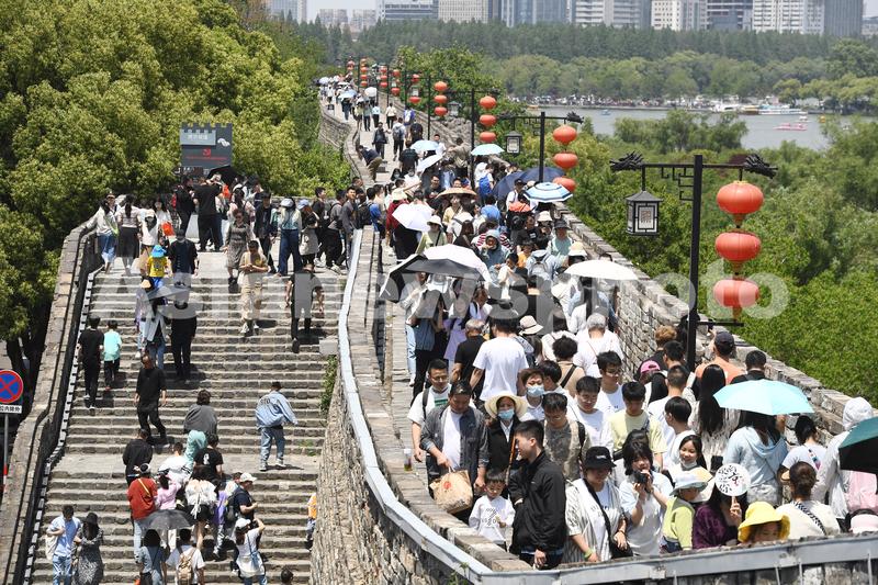 图片说明:2023年5月2日,游客在南京明城墙解放门段参观游览。