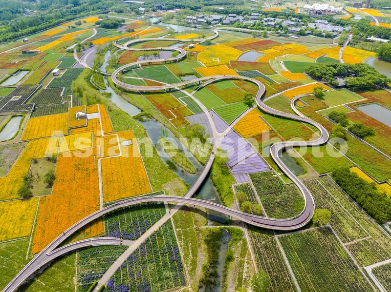 2023年5月2日,江苏省宿迁市三台山国家森林公园“衲田花海”景点,虞美人、七里黄、蓝香芥、花菱草等数十种花卉竞相开放,从高空俯瞰,大地宛如色彩斑斓的“调色盘”。