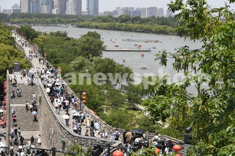 图片说明:2023年5月2日,游客在南京明城墙解放门段参观游览。