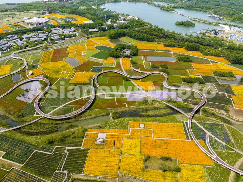 2023年5月2日,江苏省宿迁市三台山国家森林公园“衲田花海”景点,虞美人、七里黄、蓝香芥、花菱草等数十种花卉竞相开放,从高空俯瞰,大地宛如色彩斑斓的“调色盘”。