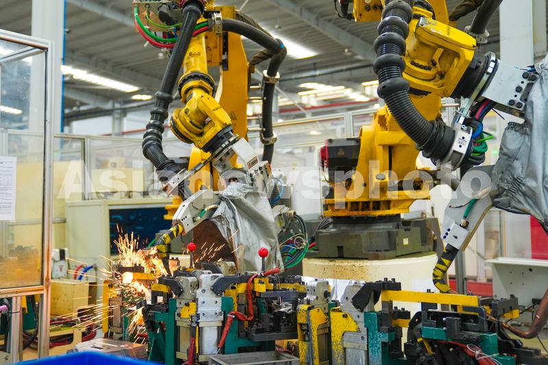 图片说明:2023年5月4日,位于浙江省湖州市长兴经济技术开发区的长兴地通汽车部件有限公司,全自动机器人高速运转,工人忙碌赶制新能源汽车配件订单产品。