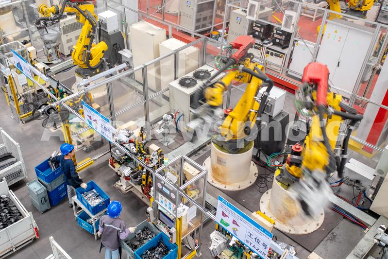 图片说明:2023年5月4日,位于浙江省湖州市长兴经济技术开发区的长兴地通汽车部件有限公司,全自动机器人高速运转,工人忙碌赶制新能源汽车配件订单产品。
