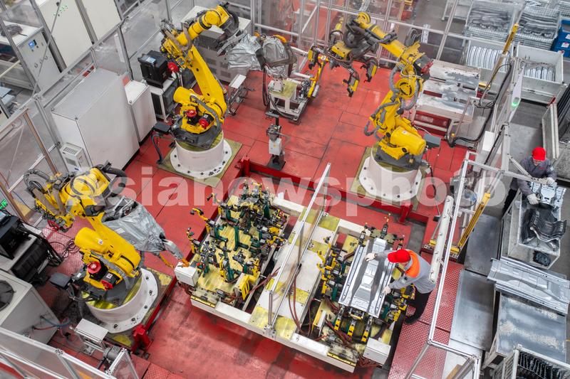 图片说明:2023年5月4日,位于浙江省湖州市长兴经济技术开发区的长兴地通汽车部件有限公司,全自动机器人高速运转,工人忙碌赶制新能源汽车配件订单产品。
