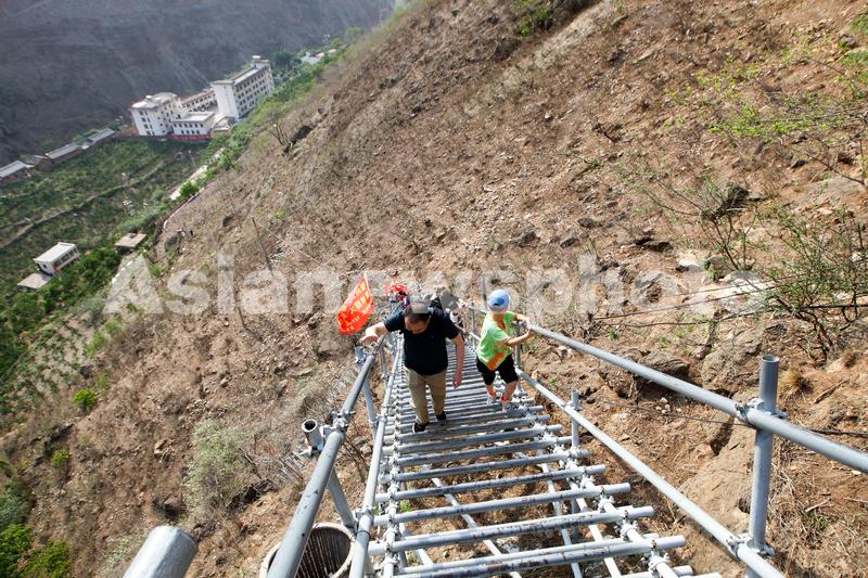 2023年5月2日,四川大凉山,游客在攀爬“悬崖村”的钢梯。