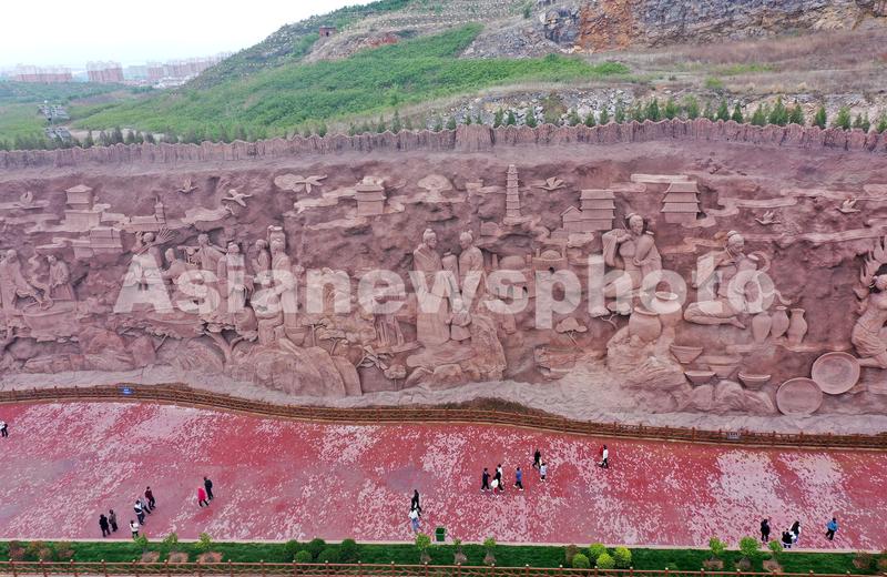 5月5日,游客在参观河北省邯郸市峰峰矿区大型磁州窑山体浮雕(无人机照片)。