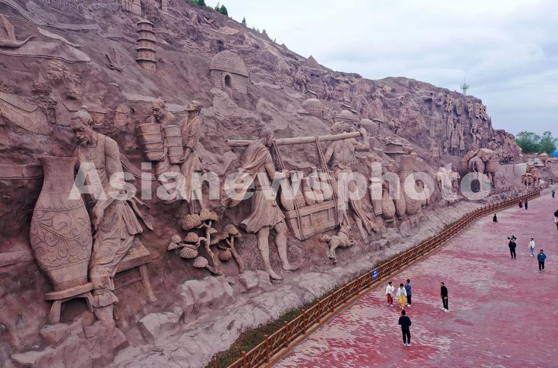 5月5日,游客在参观河北省邯郸市峰峰矿区大型磁州窑山体浮雕(无人机照片)。