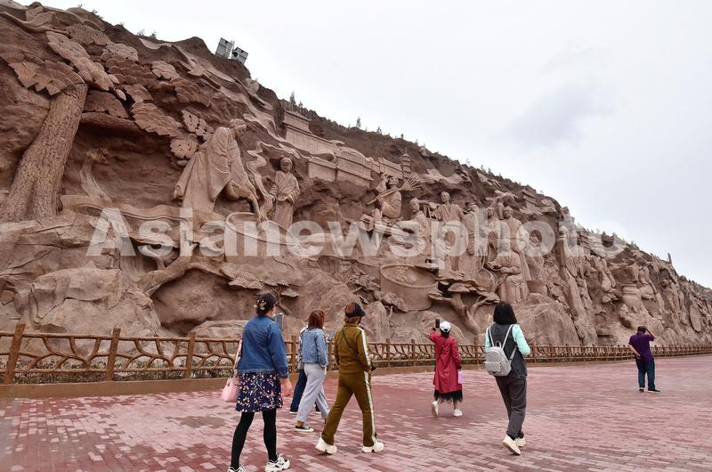 5月5日,游客在参观河北省邯郸市峰峰矿区大型磁州窑山体浮雕。
