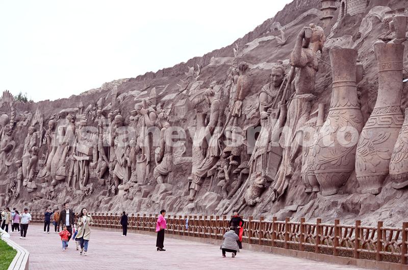5月5日,游客在参观河北省邯郸市峰峰矿区大型磁州窑山体浮雕。