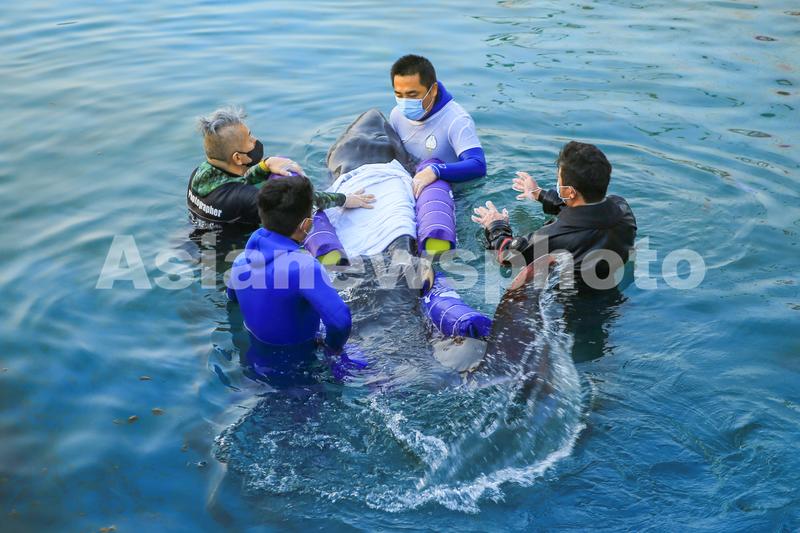 2023年2月16日下午,在三亚海昌海洋生物保育中心,潜水员志愿者林超(右二)、孙晨(右一)、王敬瑞(左一)、牛子靖(左二),安抚受伤侏儒抹香鲸,并保持它的平衡。其中牛子靖是海南大学的大三年级学生,2022年8月他考取潜水教练的资格证,在日常学习生活中,注重塑料制品循环使用,并参与海洋禁塑环保等公益活动,担任海南大学乘风书院青年志愿者协会会长,组织学生参加净滩活动,并组织宣讲队普及禁塑知识。