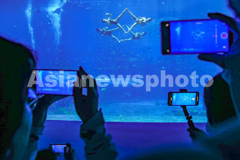 2022年6月30日,在陵水富力海洋欢乐世界,游客用手机拍摄精彩的人鱼潜水表演。