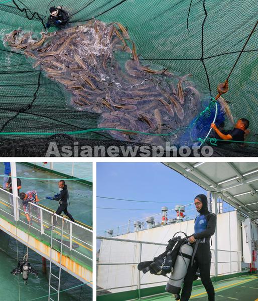 2022年11月4日,在海南省乐东龙栖湾一处海洋牧场起网首批渔获现场,“潜水青年”王鹏(左)与渔民相互配合将更多的鱼从大网中赶入小网,以提高打捞效率。 下图(左):王鹏(右)用绳子将潜水装备吊送至网箱内。 下图(右):王鹏搬运潜水装备准备潜水到网箱捕捞鱼群。