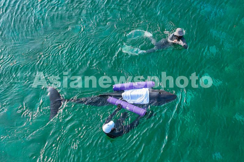 2023年2月16日下午,在三亚海昌海洋生物保育中心,“潜水青年”黄江波(下)和LJ Qiao(上)与一头受伤侏儒抹香鲸伴游,并进行悉心照顾。他们得知受伤侏儒抹香鲸需要潜水员伴游的消息后,第一时间赶到海昌海洋生物保育中心,与其他志愿者对受伤侏儒抹香鲸进行接力救助。