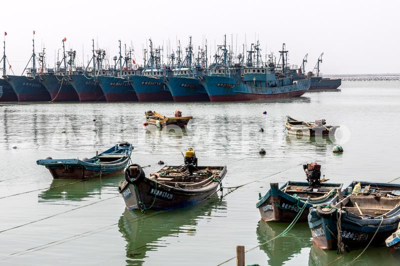 2023年5月3日,山东威海,荣成市成山镇一家码头抛锚停放的休渔渔船。