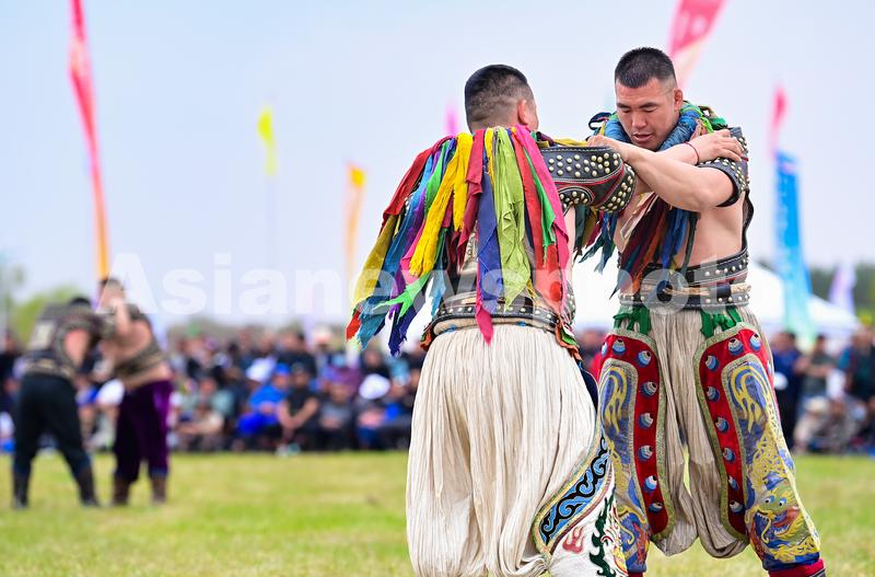 2023年5月10日,搏克手在2023伊金霍洛查干苏鲁克大典512搏克精英大赛比赛中。