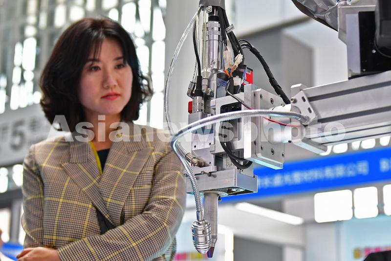 图片说明:2023年5月11日,参观者在第二十一届烟台国际装备制造业博览会上了解一款三维光纤激光焊接机。
