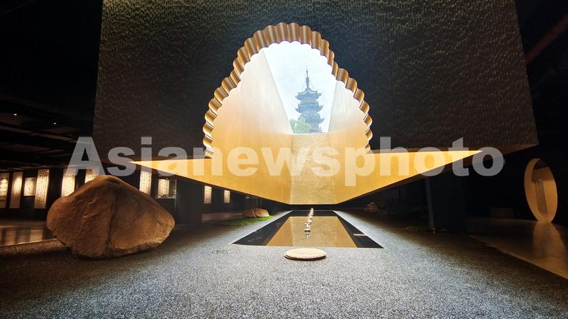 2023年5月11日,上海,龙华历史文化风貌区升级修缮后最受关注的地下“塔影空间”五一后开放预约,市民游客可以在这个集阅读、休闲、艺术展示为一体的空间沉浸式体验中华传统文化与海派风情,隔着水幕仰望魔都保存最完好的宋代千年古塔,在如同时光隧道的阅读区品味藏书,还可以欣赏海派书画及紫砂壶展览。