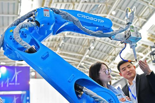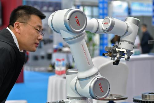 图片说明:2023年5月11日,参观者在第二十一届烟台国际装备制造业博览会上了解一款工业机械臂。