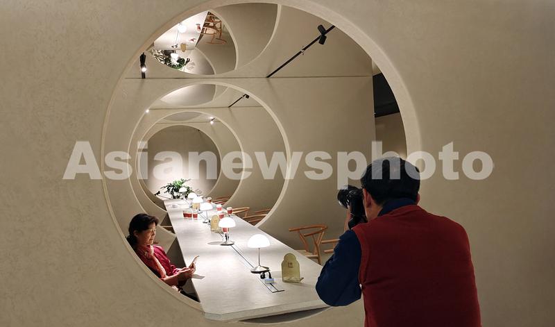 2023年5月11日,上海,龙华历史文化风貌区的地下“塔影空间”内,游客在宛如时光隧道的阅读区拍照打卡。
