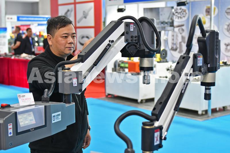 2023年5月11日,参观者在第二十一届烟台国际装备制造业博览会上了解一款电动攻丝机。