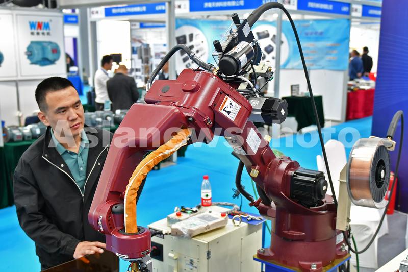 2023年5月11日,参观者在第二十一届烟台国际装备制造业博览会上了解一款焊接机器人。