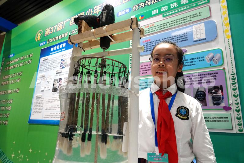 5月14日,在第37届广西青少年科技创新大赛上,一名参赛小学生在展示自己的“自动洗笔机”作品。