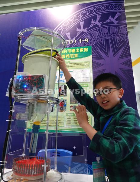 5月14日,在第37届广西青少年科技创新大赛上,一名参赛小学生在演示自己的“智能喂鸡装置”作品。