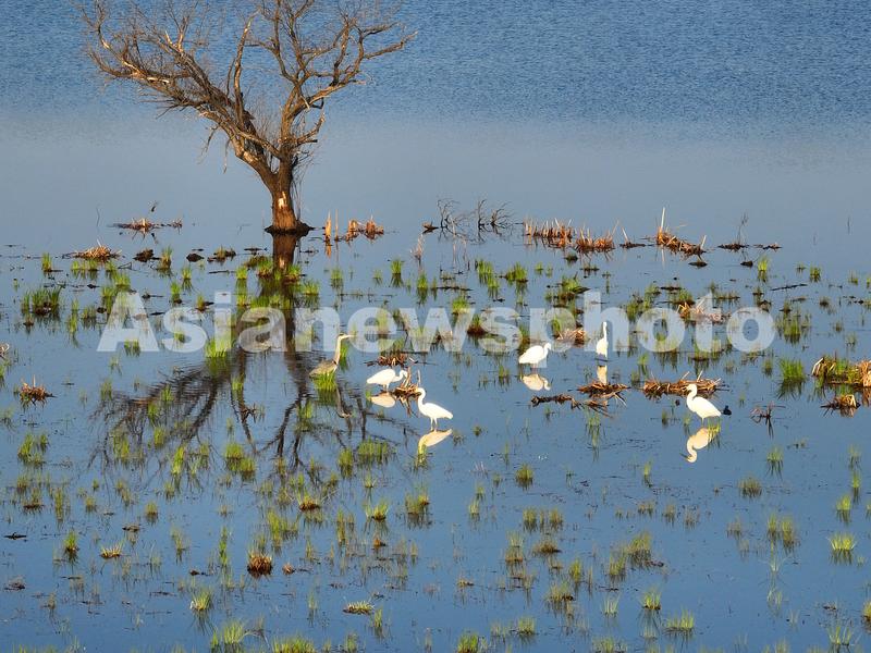 2023年5月12日清晨,黑龙江省饶河县乌苏里江国家湿地公园栖息的白鹭在觅食。