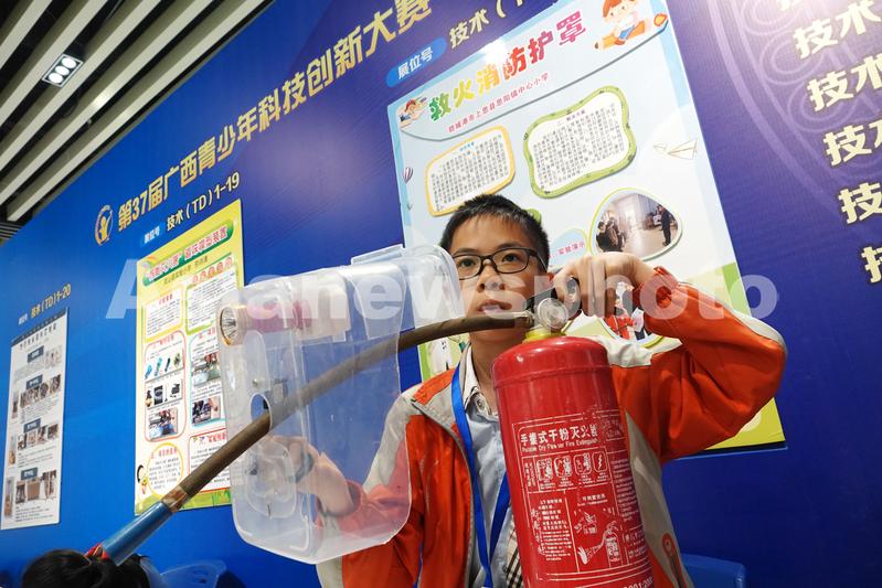 5月14日,在第37届广西青少年科技创新大赛上,一名参赛小学生在展示自己的“救火消防护罩”作品。