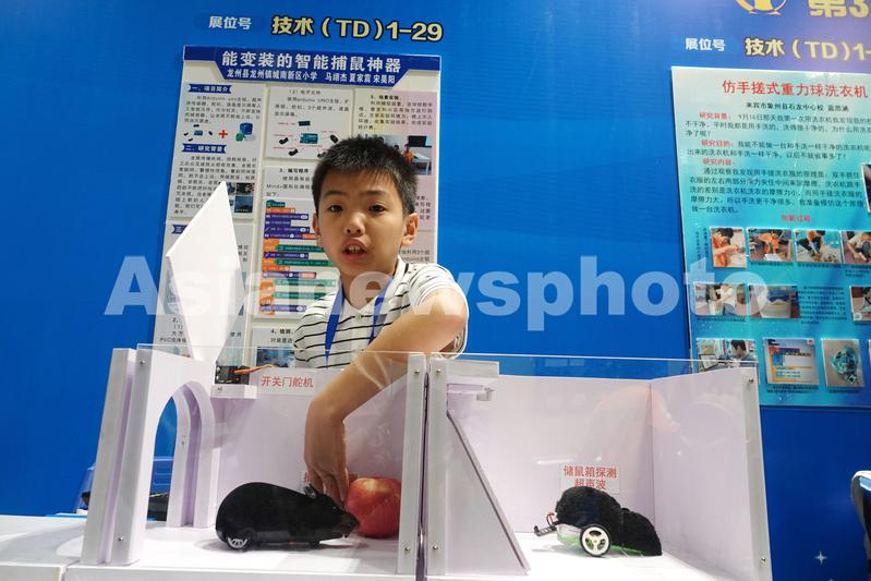 5月14日,在第37届广西青少年科技创新大赛上,一名参赛小学生在展示自己的“智能捕鼠神器”作品。
