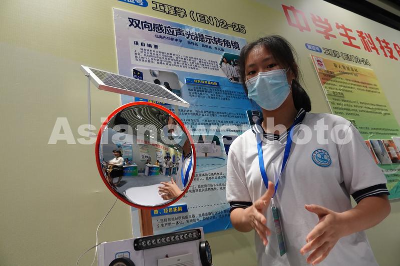 5月14日,在第37届广西青少年科技创新大赛上,一名参赛中学生在展示自己的“双向感应声光提示转角镜”作品。