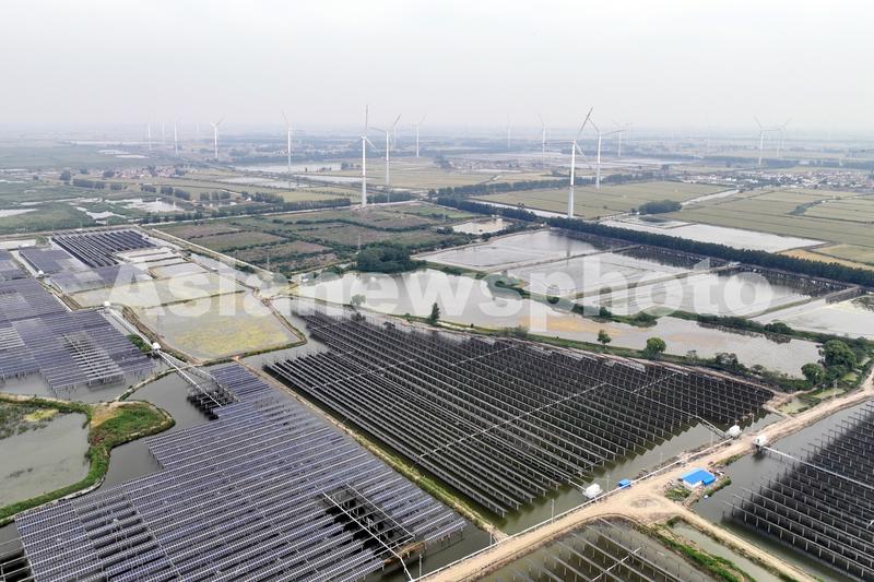 2023年5月16日,在江苏省扬州市宝应县柳堡镇郑渡村“风光渔”互补基地,“蓝盔甲”与风力发电、鱼塘和村庄相映衬,构成一幅绿色能源新画卷。