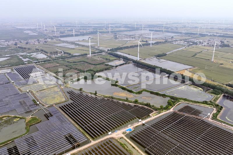 2023年5月16日,在江苏省扬州市宝应县柳堡镇郑渡村“风光渔”互补基地,“蓝盔甲”与风力发电、鱼塘和村庄相映衬,构成一幅绿色能源新画卷。