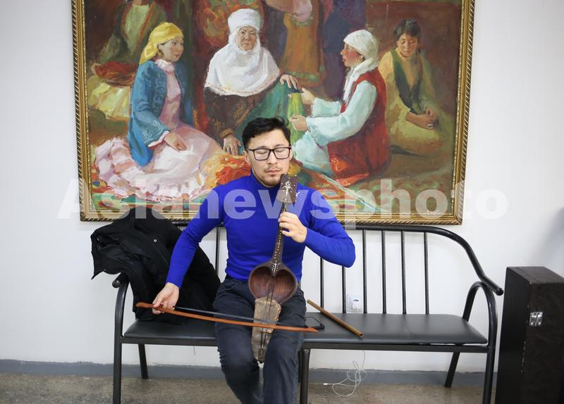 2月14日,哈萨克斯坦国立艺术学院,学生Yerzhan Baiseitov排练传统乐器Qobyz。