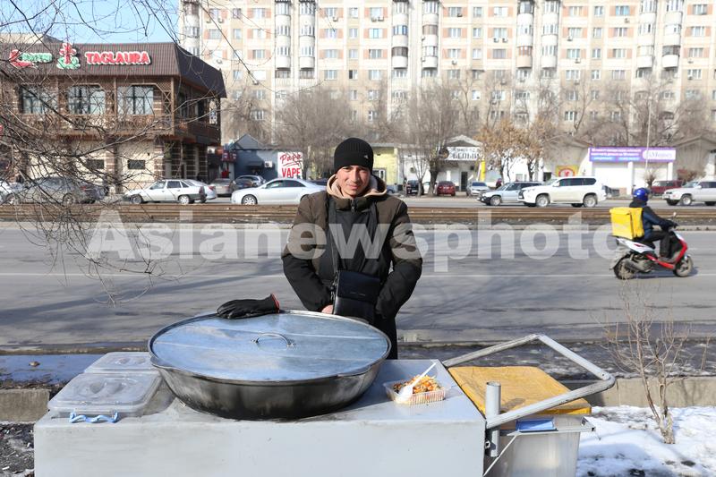 2月15日,阿拉木图街头卖抓饭的摊贩。