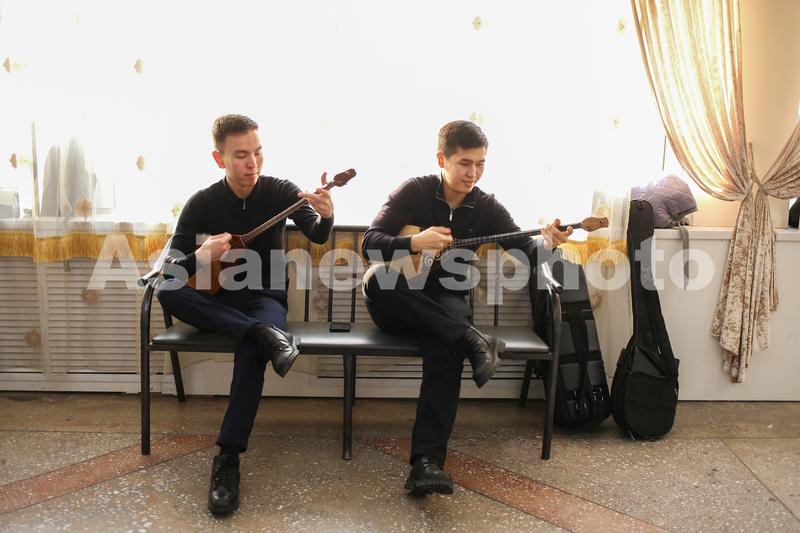 2月14日,哈萨克斯坦国立艺术学院,学生Dastan(右)和同学一起排练冬不拉。