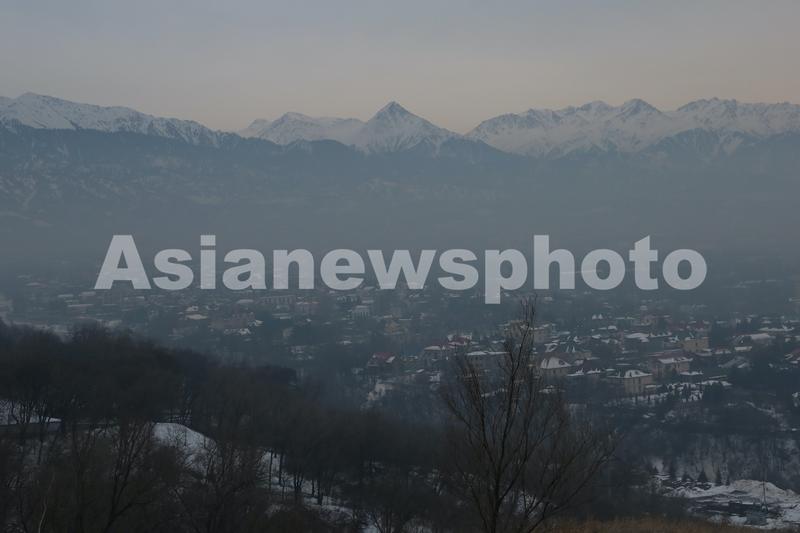 2月17日,俯瞰雾霾笼罩下的阿拉木图城区,远处是天山山脉。