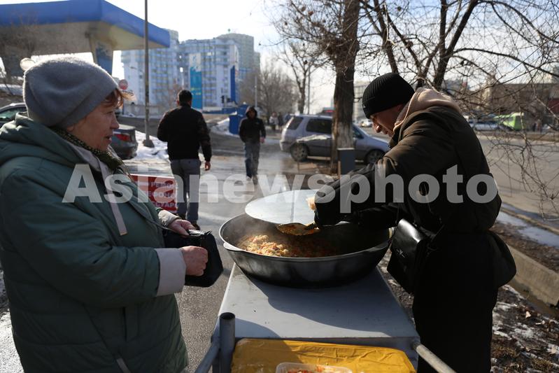 2月15日,阿拉木图街头卖抓饭的摊贩。