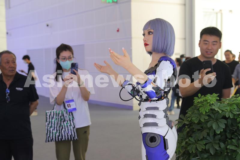 第七届世界智能大会智能科技展上,智能机器人为观众介绍参展企业。