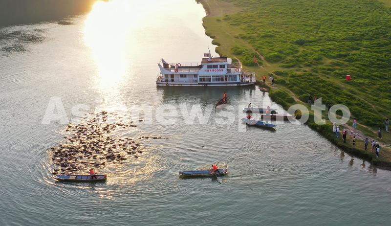 图片说明:2023年5月18日,在四川省南充市蓬安县相如镇油房沟村嘉陵江段,游客观看牛群渡江归栏(无人机照片)。