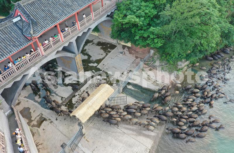 图片说明:2023年5月18日,在四川省南充市蓬安县相如镇油房沟村嘉陵江段,游客观看牛群渡江归栏(无人机照片)。